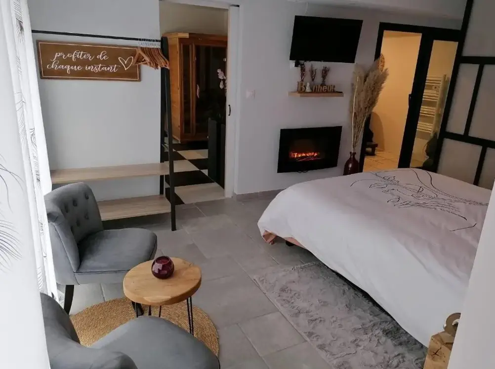 Chambre de Brunemont offers a cozy retreat located at 204 Rue de Brunemont, 62460 Diéval, France. The accommodation features private parking, a flat-screen TV, a hot tub, and a kitchen. Guests can enjoy a terrace with scenic views and access to shared facilities including a sauna and shower. Nearby attractions include Les Quatre Vents at 2.